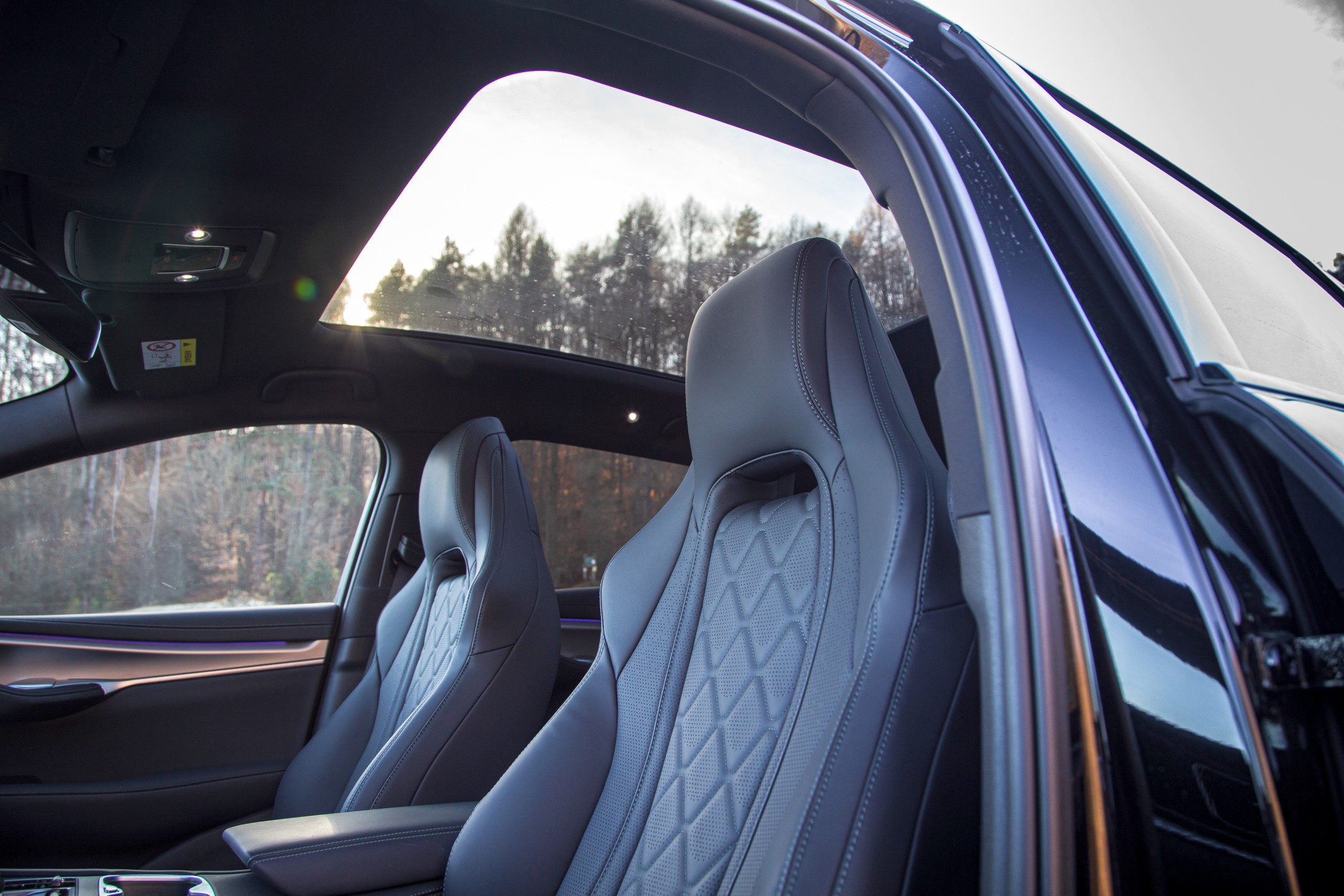 Confortul este, fără îndoială, tema dominantă. Scaunele față dispun de funcție de ventilație și încălzire, oferind totodată reglaje electrice ample, aspect care transformă fiecare deplasare într-o experiență extrem de comodă. Iluminarea ambientală cu 128 de culori permite personalizarea atmosferei, iar sistemul audio premium cu 12 difuzoare semnat de Dynaudio oferă o scenă sonoră amplă, bine echilibrată.
