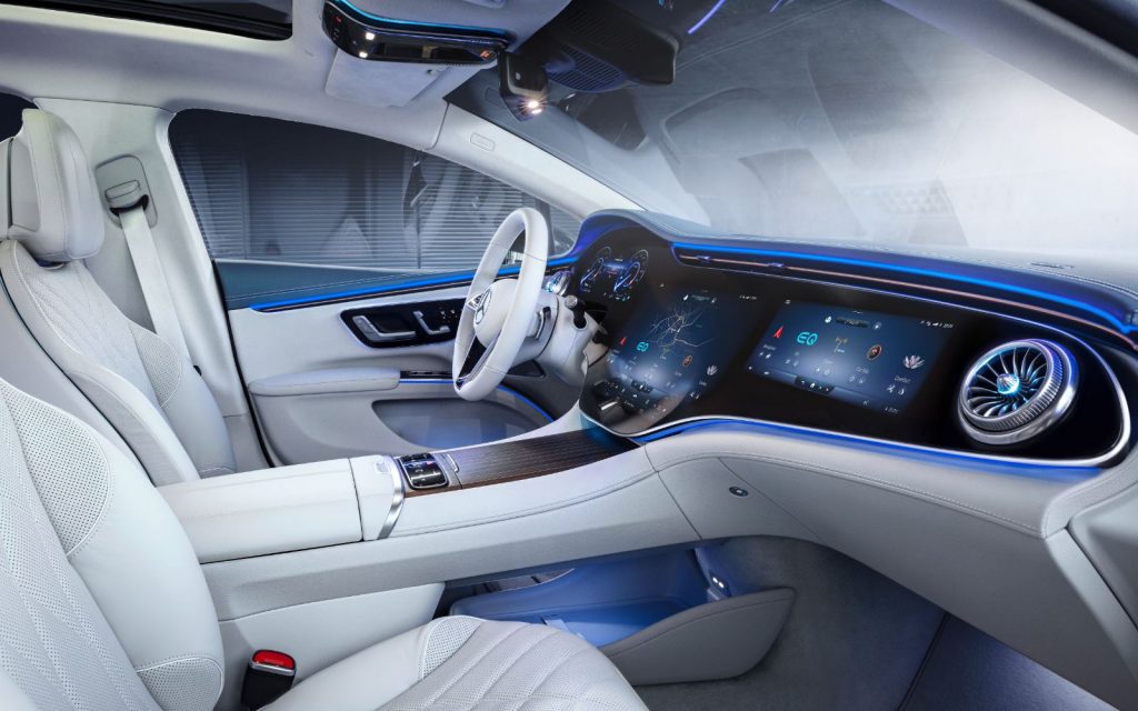 Totuși, avem impresia că majoritatea clienților lui EQS vor opta pentru Hyperscreen. În spatele imensului ecran funcționează un sistem de operare dotat cu un procesor cu opt nuclee, care este ajutat de 24 GB de memorie RAM. Ecranul va mai dispune și de 12 actuatoare care au rolul de a oferi feedback haptic în zona unde a fost atins. Sistemul mai beneficiază de inteligență artificială și va putea fi reîmprospătat pe partea de software prin intermediul updateurilor over-the-air.